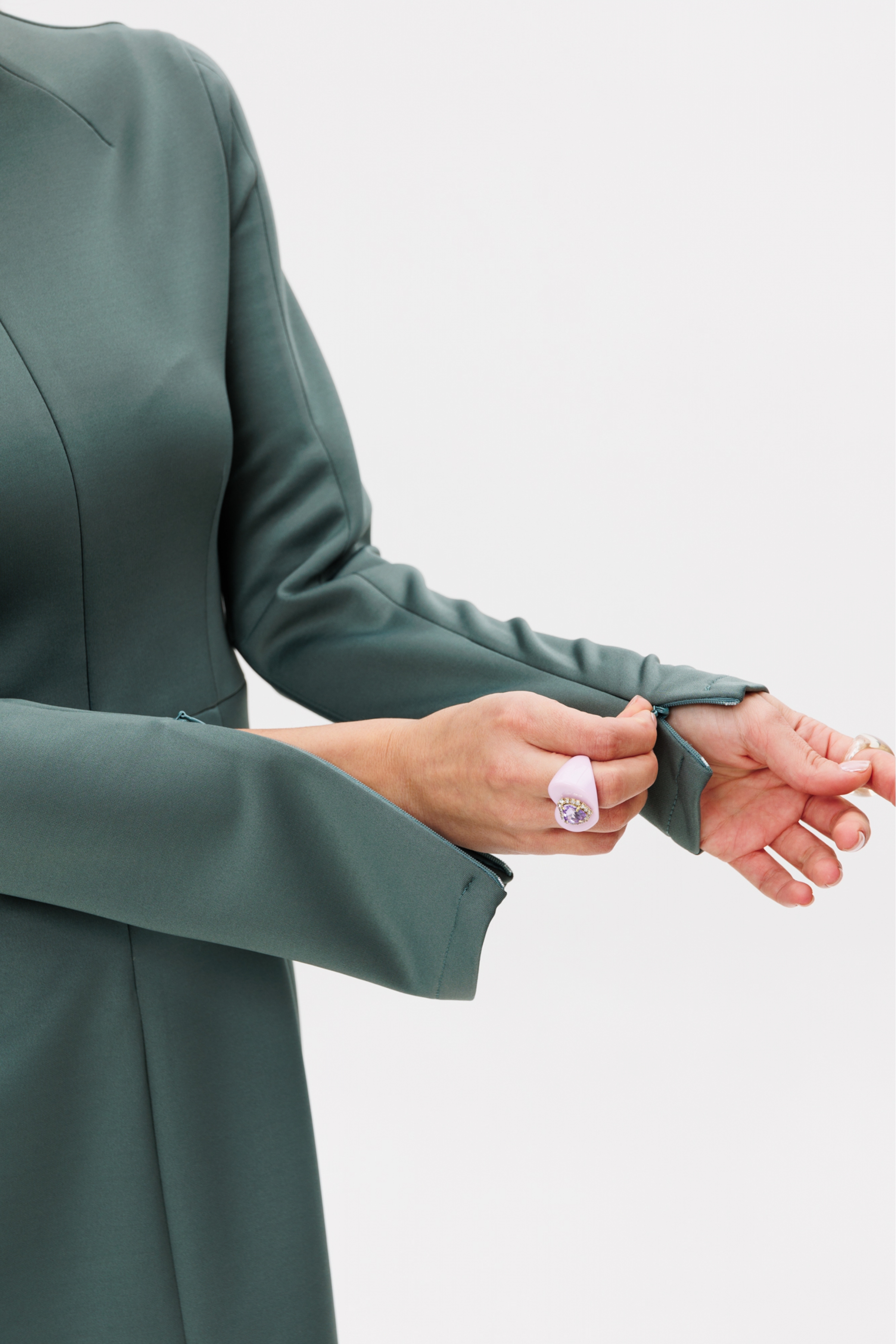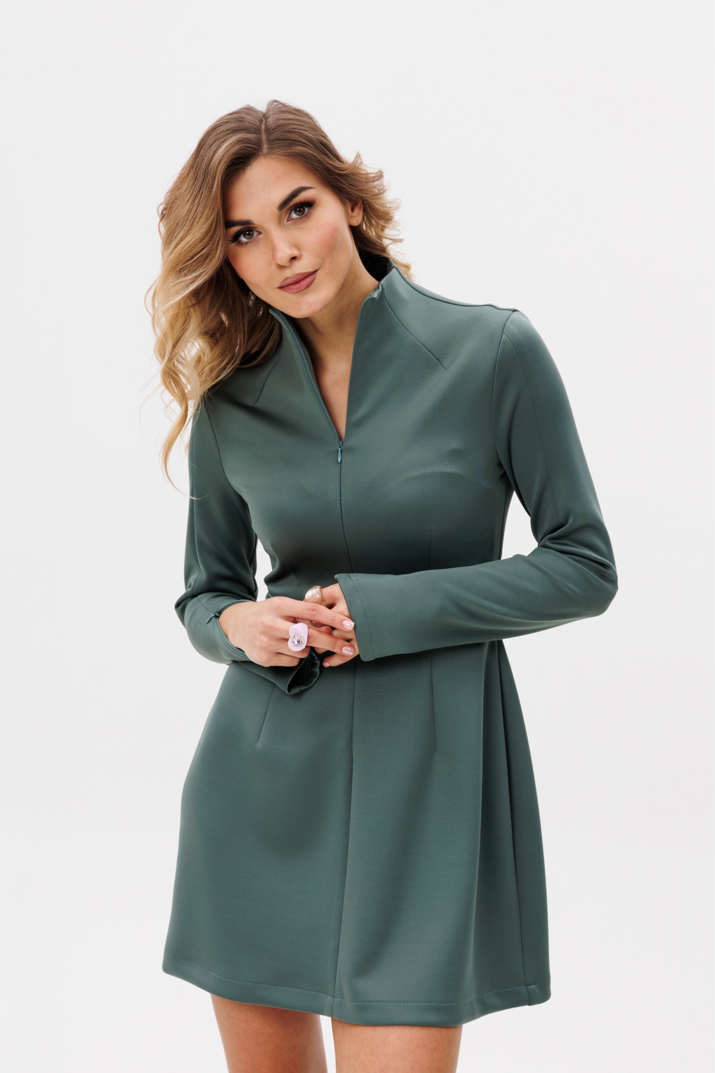 Платье выполнено из трикотажного полотна. Платье приталенного силуэта, отрезное по линии талии, длиной выше линии колена. Спереди вытачки для прилегания цельнокроеной стойки и средний шов с застежкой на потайную молнию. Рукав втачной, двухшовный с локтевой вытачкой. В переднем шве рукав с потайной молнией.