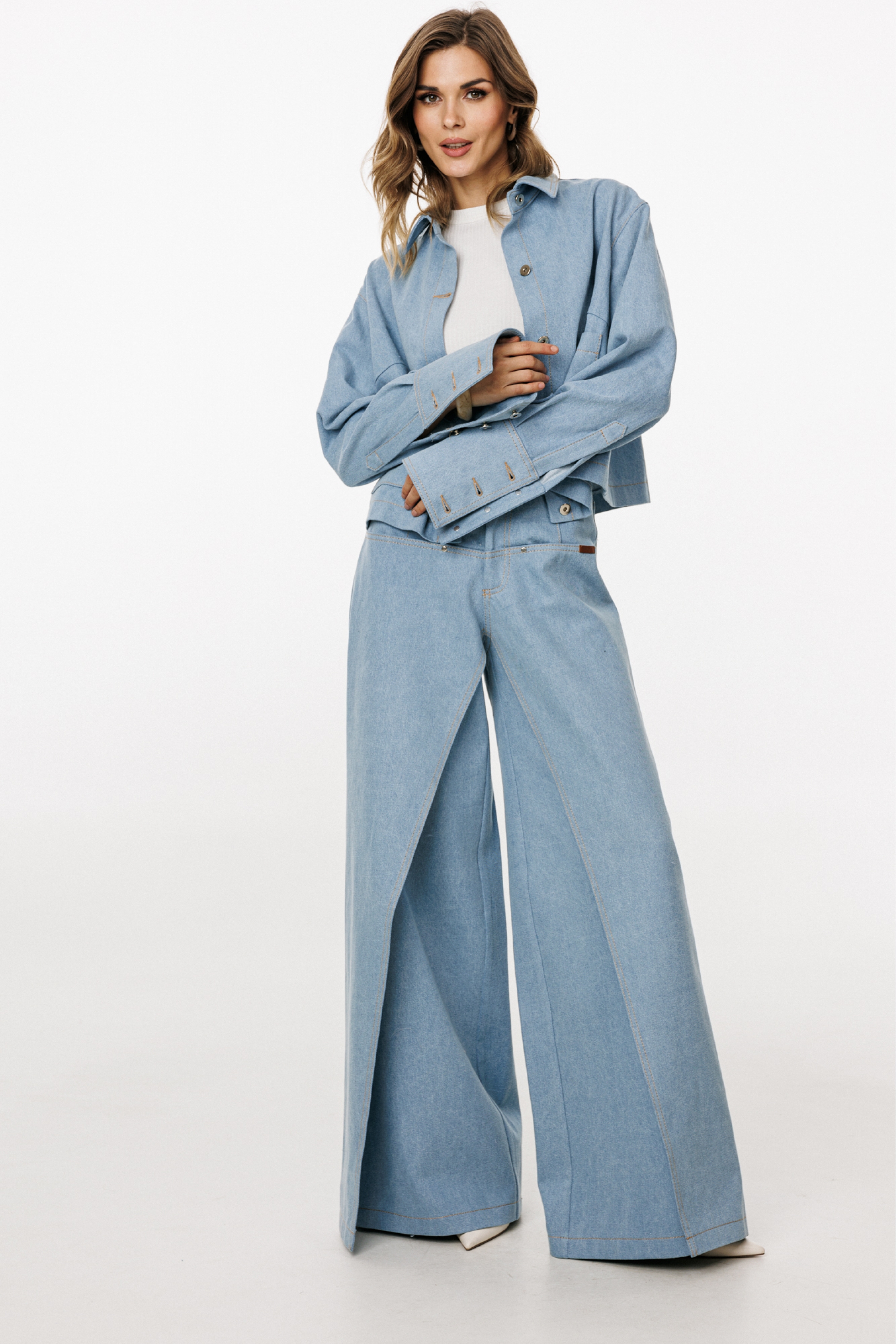 Блузка выполнена из плотного джинса. Блузка прямого силуэта, длиной ниже линии талии. Спереди накладные карманы и центральная застежка с планкой на пробивные пуговицы. На спинке кокетка и две складки. Воротник стояче-отложной с отрезной стойкой. Плечевой шов удлинен. Рукав рубашечного покроя, одношовный. Низ рукава на притачной манжете с застежкой на пробивные пуговицы. Рукав удлинен. Блузка декорирована по кокетке спинки нашивкой из натуральной кожи.